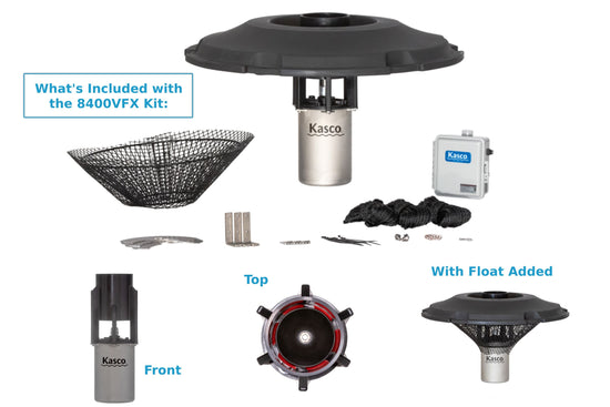 FREE SHIPPING! Great display for up to 1.5 acre aerating. Kasco Marine's 2HP Floating Aerating Fountain is great for larger ponds. The classic Kasco "V" fountain pattern, 8' tall x 32' wide gives this model a beautiful fountain pattern, while still providing good aeration. The larger motor and enhanced propeller design gives the 8400VFX 2.5 times the water flow as the 4400VFX. 3-year warranty (extended warranty available).