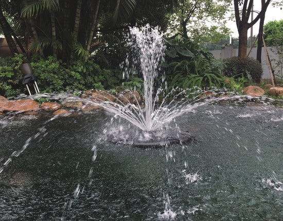 Large water droplets provide lots of aeration and cool ambient sound. This is a very beautiful unit. Please see video of fountain in action. This is a formidable pond fountain. Your neighbors will enjoy it too! Compare to other 1/2HP units that claim to run on under 300 watts (don't believe that that is possible)!