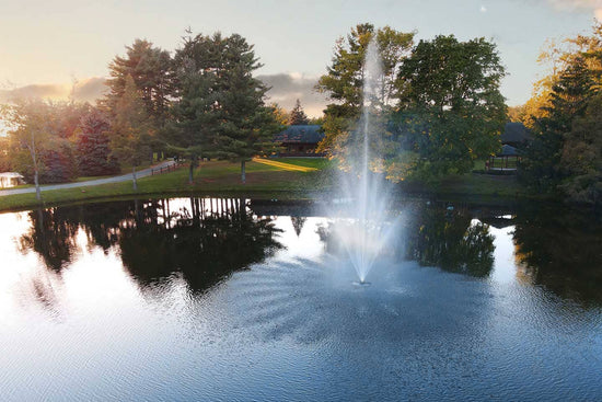 The Amherst Fountain adds beauty to your water feature while contributing to a healthy aquatic environment through oxygen transfer and water circulation. The classic, stately pattern of The Amherst 2 HP Fountain provides a very distinct separation of all three tiers, capped by an impressive column reaching heights of 20 feet or higher in deep ponds. Approximately 40' wide. The 170 gallons-per-minute flow rate creates a pleasing ripple effect across the water’s surface.
